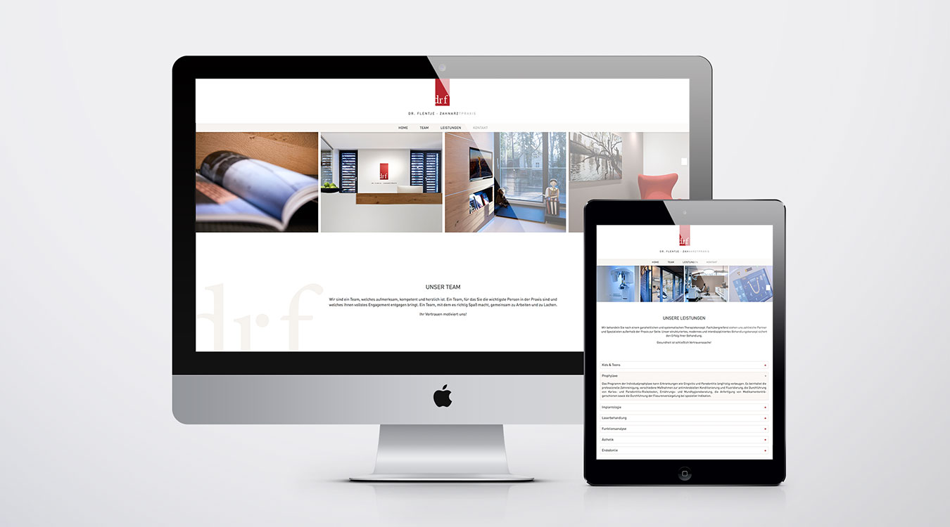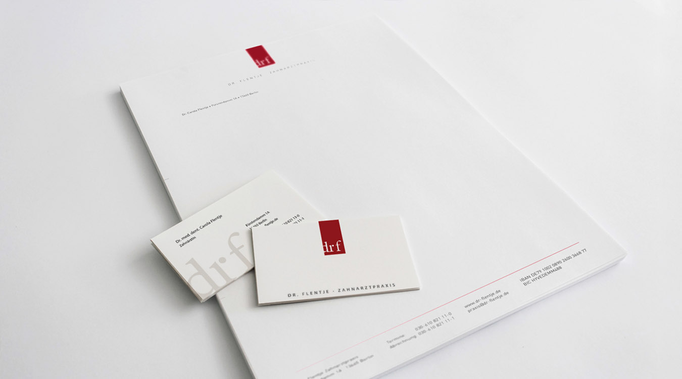 Der Umzug in neue Praxisräume ist ein guter Anlass überholtes hinter sich zu lassen – so sieht das auch Frau Dr. Flentje. Der hohe Anspruch der Kundin zahlt sich aus; das neue Corporate Design passt nicht nur perfekt zur Innenarchitektur, auch Drucksachen, Website und Praxiskleidung – alles aus einem Guss.
